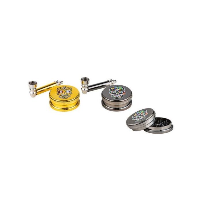 Crazy Skull Raucher-Set – Metallpfeife und Grinder im einheitlichen Design
